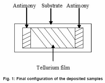 The mica mask used to generate the required design were washed with soap detergent and rinsed with water. This was followed by ultrasonic agitation in deionised water, acetone, and ethyl alcohol for twenty minutes each. The polished glass slides that were used as substrates were first boiled in chromic acid and ultrasonically cleaned as described for mica mask above. The substrates (glass slides) were then enclosed in a vacuum chamber (Edward coating Unit model 306) and tellurium films of thickness 1000A0 were deposited on the substrate from a tungsten filament at a pressure of 5×10-5torr. Electrical contacts were made to opposite ends of the films by depositing Sb metal on the electrode width. All the evaporant were of 5N9 purity. The final configuration of films is shown in fig. 1. The current–voltage characteristics of the samples were measured with a digital electrometer (Keittley, type 160B) and a digital multivoltmeter (Hewlett – Packard type 3465A) at room temperature.