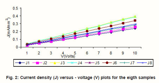 The conductance of the samples were calculated from the slope of the best line of fit of the current density – voltage plots (fig2) and using the relationship,