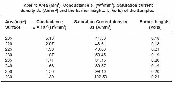 Table 1: Area (mm2), Conductance s (W-1/mm2), Saturation current density Js (A/mm2) and the barrier heights fB (Volts) of the Samples