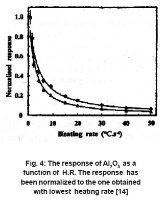 Another important data reported by G. Kitis is the variation of integral and peak height with HR. Here TL response of α- Al2O3 :C is normalized to the response at lower HR (0.6OC/S). Here • is for integral and Δ is for peak height (Fig. 4 )