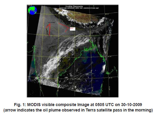 Figure 1: MODIS visible composite Image at 0505 UTC on 30-10-2009 (arrow indicates the oil plume observed in Terra satellite pass in the morning)
