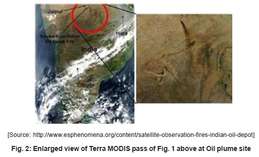 In this article the analysis of the oil depot plume over the outskirt area of Jaipur city is based on the spectral signature seen in the MODIS image. The plume of fire detection strategy is based on detection relative to the thermal emission of surrounding pixels. In this method plume pixels have values elevated above a background thermal emission obtained from the surrounding pixels. This method has limitation for variability of the surface temperature and reflection by sunlight. Visible composite MODIS image of Terra satellite on 30-10-2009 at 0505 UTC is shown in Fig. 1 along with its enlarged view (Fig 2). It is clear from the plume observed in both the figs (1 & 2) the prevailing wind direction was from South-South West, West-West North and in most cases variable at outskirts of Jaipur city. There is haze like situations surrounding the oil depot in Sitapur area and Banas river (Fig 1). The same situations are shown as an enlarged view of the scene seen in the image.