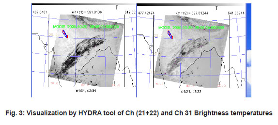 Figure 3: Visualization by HYDRA tool of Ch (21+22) and Ch 31 Brightness temperatures