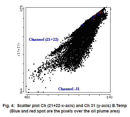 Figure 4: Scatter plot Ch (21+22-x-axis) and Ch 31 (y-axis) B.Temp (Blue and red spot are the pixels over the oil plume area)