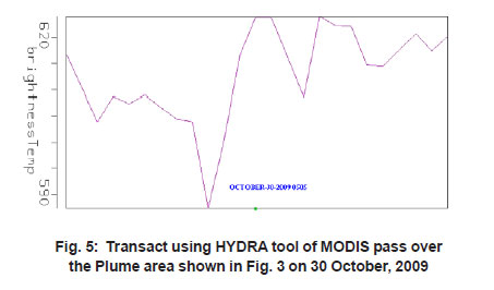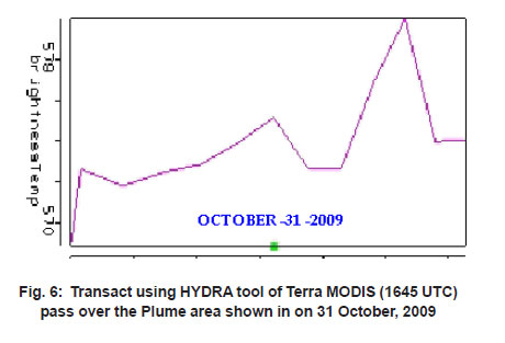 Figure 6: Transact using HYDRA tool of Terra MODIS (1645 UTC) pass over the Plume area shown in on 31 October, 2009