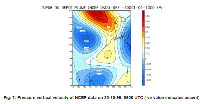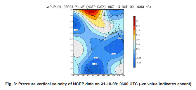 Due to the intense heat of the fire, the plume was highly buoyant and rose rapidly and vertically within the atmosphere. The large amount of vertical wind shear present on 29-10-2009 enabled the height attained by the plume. The negative of vertical velocity field denotes the ascent of the heat, induced pollutant or organic matter over that area. The momentum gained by the plume can be better understood by knowing the nature of the vertical velocity over the area. The pressure vertical velocity (-0.02) is marked by an arrow over that area (Fig 7 & 8). It is clear from the negative value of pressure vertical velocity that there is an upward momentum of the constituents which spread over the area and increase the loading in the atmosphere. The actual images of the plume of fire are shown in the Figs 9 & 10.