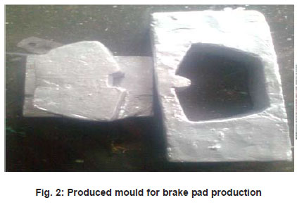 The cow bone granules, palm kernel shell granules and iron filing was properly mixed in proportion10 shown in Table 1 to form homogenous mix. Proportion of Sodium Silicate used as binder was 20% of oven dry weight of mix.11 The mix was thereafter transferred to the produced mould (Fig. 2), which was mounted on the 100 – ton hydraulic press. After removing sample from press, the brake pad was cured in an oven at a temperature of 1200C for eight (8) hours [5].  A prototype of the produced brake pad is shown in Fig. 3.