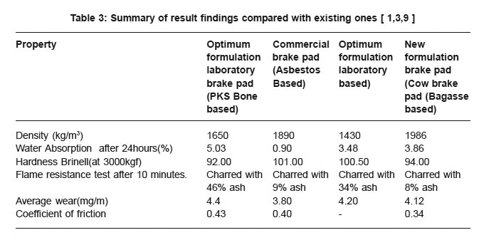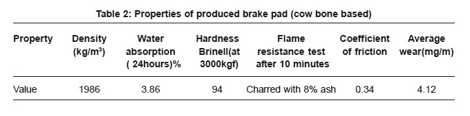 Properties of produced brake pad (cow bone based) is presented in Table 2 ,while Table 3 shows the Summary of result findings compared with some existing ones.