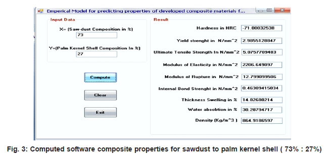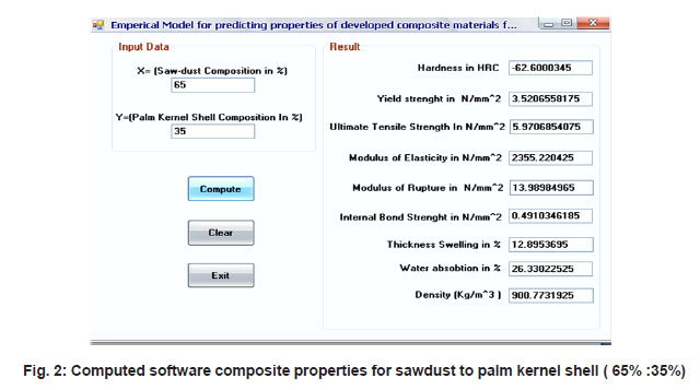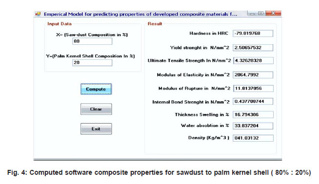 Visual basic application to computing predicted values software was developed using Visual Basics 6.0 for computing predicted composite materials properties. Visual Basic was used as a rapid application tool to compute the properties from empirical models. Figs. 1 – 4 show a samples of computed values, when the sawdust : palm kernel shell composition was 90% : 10%, 65%:35%, 73%:27% and 80 %:20% respectively. The values from this software program were found to be in conformity with the analytical values from developed model.
