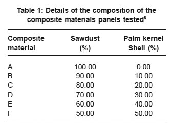 Sawdust from mahogany and palm kernel shell used to produced the composite material were obtained from Benin City, Edo State, Nigeria, while urea formaldehyde was used as binder.8