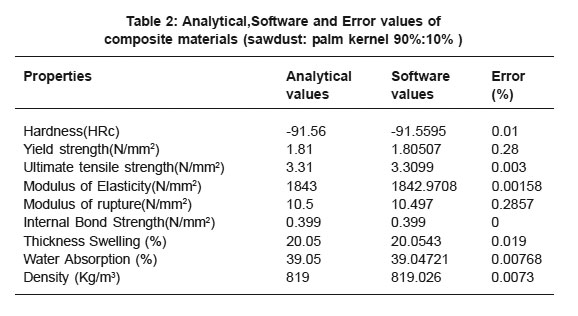 Table 2: Analytical,Software and Error values of composite materials (sawdust: palm kernel 90%:10% )