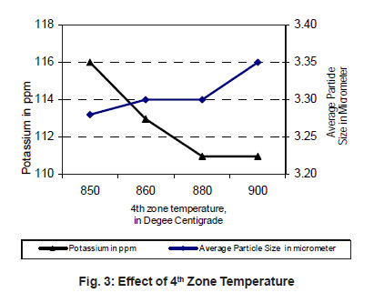 And with increase in 4th zone temperature potassium content in the powder decreases. The dopants are relatively volatile so that at low temperatures the dopants are retained and are entrapped in the reduced metal powder. At high temperatures the dopants will be driven off before they become entrapped by the reduction to tungsten metal. Hence Potassium content decreases with increase in 4th Zone temperature.10