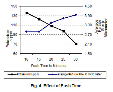 With increase in push time, the residence time of the powder in the 4th zone increases. This will increase the contact time between the powder and hydrogen flowing counter current to the feeding direction. As a result the interaction between the powder particles and moist hydrogen will be enhanced. Consequently, the particle size of the powder will increase. Similarly the potassium content of the powder will decrease due to the increase in particle size and also as hydrogen carries away more potassium due to increase in residence time of the powder inside the furnace.
