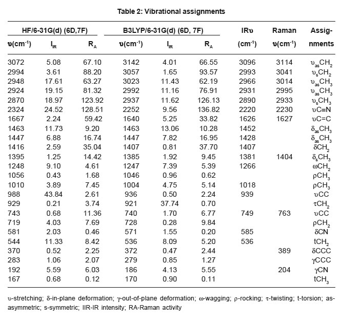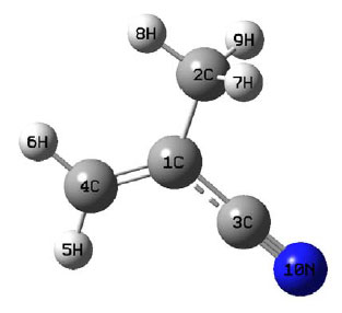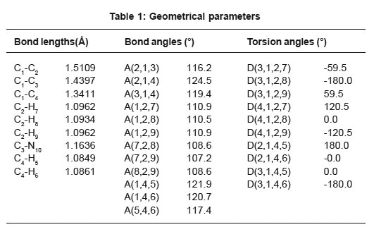 Methacrylonitrile is an aliphatic nitrile used extensively in the preparation of homo- and copolymers, elastomers, and plastics and as a chemical intermediate in the preparation of acids, amides esters and other nitriles. This aliphatic nitrile is also used as a replacement for acrylonitrile in the manufacture of an acrylonitrile/butadiene/ styrene-like polymer. Youcef et al.1 reported the study of ETFE based radiation grafted poly(styrene sulfonic acid-co-methacrylonitrile) proton conducted membranes with increased stability. Several authors reported on the use of styrene/ acrylonitrile,2,3 α-methylstyrene.styrene4 and p-methylstyrene/tert-butyl styrene5 as grafting monomers. Oh et al.6 reported an ab initio study of the molecular elimination reactions of methacrylonitrile. Extensitve studies have unveiled the aldoxime-nitrile pathway in microorganisms7,8 and the biological metabolism for nitrile compounds is increasingly noticed.9 In the present study, the IR, Raman and theoretical calculations of the wavenumbers of the title compound are reported.