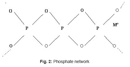 In general it is found that the melting point of glasses in borosilicate system (BS1-BS7) is lowered in comparison to that in the phosphate system (P-1) (Table III). Thus more energy and time is required to form the phosphate network. This is possibly due to the presence of simultaneous formers in borosilicate system, namely boron and silicon (Fig. 1) whereas in case of phosphate network,3 there is only one former atom (phosphorous, Fig. 2). The difference in bond strengths also contributes to this. In addition to these effects, the different modifier ions (added as oxides) can also lower the melting temperature of a particular composition of the phosphate system or borosilicate systems.4 Here the mechanism is that the modifier ion (Mn+) dissociates a Si-O (or B- O or P-O) bond of network and generates anionic O sites (O-) and gets attached to such sites ionically. Additionally the variation in m. p. among different compositions in the particular borosilicate system (BS1 to BS7) can be explained due to different types of modifier oxides being added.