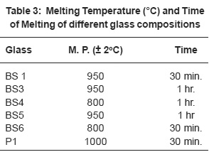 Table 3: Melting Temperature (°C) and Time of Melting of different glass compositions