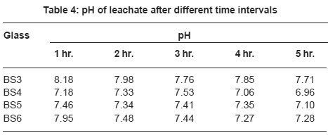 The decreasing trend in the pH value from 1 hr to 5 hr data can be explained in the light that with higher extent of leaching, more modifier cations are released into the solution increasing the ionic potential and therefore leading to lowering of pH values.