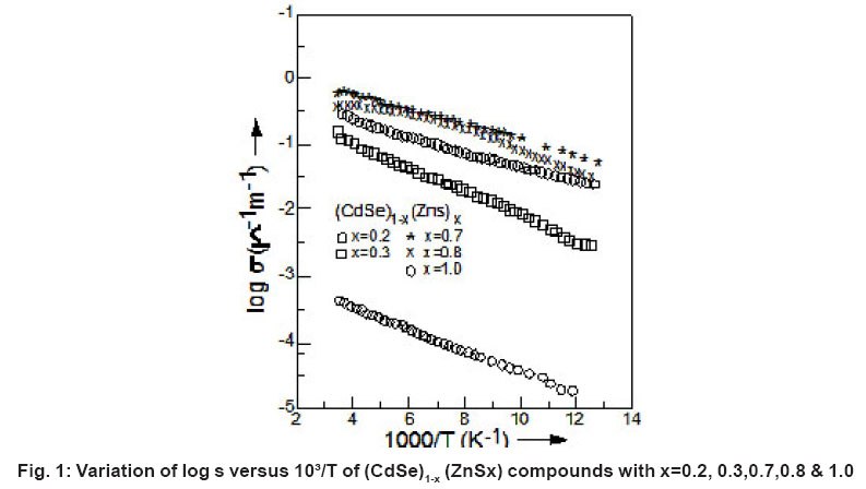 Figure 1: Variation of log s versus 10³/T of (CdSe)1-x (ZnSx) compounds with x=0.2, 0.3,0.7,0.8 & 1.0