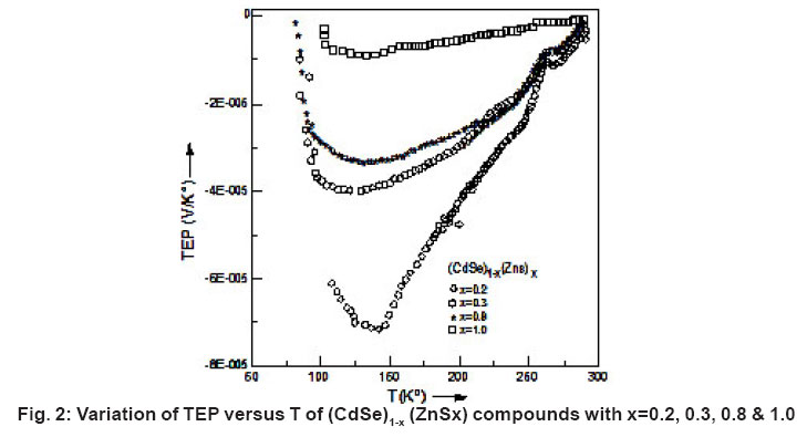 (CdSe)1-x(ZnS)x crystals exhibit n-type conductivity in the temperature region (77 – 300 °K). It is observed from the Fig.2 that the temperature dependence of TEP is approximately non-linear (before and after obtaining minimum value) and supports the power law dependence of temperature. The TEP is proportional to the nth power of the absolute temperature. For such cases the dependence of TEP on temperature is weaker and follows the exponential variation12.