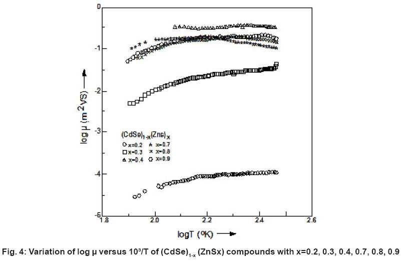The values of charge carrier mobilities were calculated for all (CdSe)1-x(ZnS)x samples using the experimental values of electrical conductivity (s) and carrier concentration n obtained from TEP data using the equation 3. The temperature variation of mobility (logm vs LogT) of (CdSe)1-x(ZnS)x polycrystalline samples with x = 0.2 – 1.0 is shown in Fig. 4. One can note that the charge carrier concentration is a weak function of composition (x) but it varies with temperature as shown in Fig. 3. The interesting result in all the samples is that the mobility increases significantly with the temperature as well as with the composition in the observed temperature region (77 – 300° K). It is worth noting that R. Venugopal and B.K. Reddy14 have reported similar results in ZnSe0.5 CdS0.5 alloy films and they attributed their results to the complicated behaviour of the mobility against temperature. The carrier mobilites in films formed at higher temperatures are comparatively higher. This is due to an increase in crystallinity and also due to an improvement in the stoichiometry of the films formed at higher temperature. Further, the high temperature mobilities are higher than the low temperature mobilities in films formed at both the substrate temperatures. Kowk and Siu15 reported similar increase in mobility with temperature in CdS films.