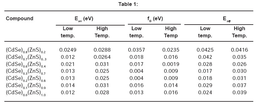 It is observed from the Table that the conductivity activation energy at lower and higher temperature zones decreases with increase in concentration of ZnS from x = 0.2 to 0.7 and it increases as x varies from x = 0.8 to 1.0. This result may be correlated with the variation in resistivity and conductivity10, 11
