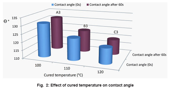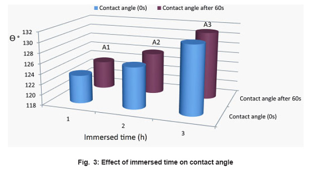 from the water contact angle results of cured acetate fabric with 9.2, 10, 11.5 and 12 mL of HCL. The obtained results reveal that the water contact angle of the cured samples decrease when the acid concentration increases. It is shown that the average size of the silica particles augmented with the increase of acid. This is because the higher acid concentration accelerated silica sol to condense and silica particles to be aggregated. Fig. 2 show the comparison diagram achieved from the water contact angle results of treated acetate fabric in 100, 110 and 120 °C cured temperatures and Fig. 3 explore the effect of immersed time (h) on the water contact angle of treated acetate fabric. The results show that, by increased the reaction time, the contact angle of acetate treated fabric increases and with increased the cured temperature, the contact angle decreases. Results of the contact angle measurement are presented in Table 2.