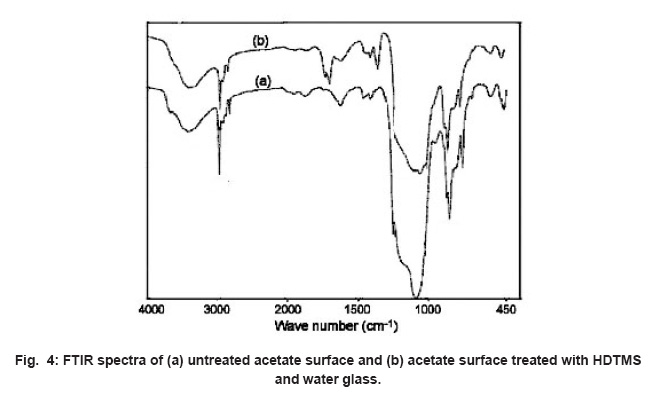 Figure 4: FTIR spectra of (a) untreated acetate surface and (b) acetate surface treated with HDTMS and water glass.