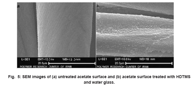 Figure 5: SEM images of (a) untreated acetate surface and (b) acetate surface treated with HDTMS and water glass.