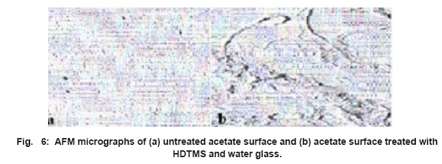 Figure 6: AFM micrographs of (a) untreated acetate surface and (b) acetate surface treated with HDTMS and water glass.