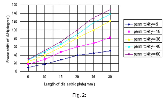 The first is with a single –layer dielectric plate attached to the transmission line, as shown In Fig.1(b); the second is with a dual-layer combination of dielectric plate, both attached to, And 0.1mm under, the transmission line, as shown in Fig1(c).The edge of the upper dielectric Plate are tapered to suppress the reflection loss. The substrate has a permittivity of 4.0 F/m and dimensions of (40*12*2)mm3. The width of the transmission line is 2mm. The dimensions of the dielectric plate Is (L*10*1) mm3,where 0< L<30mm. Fig2shows the phase of S21simulated with singlelayer dielectric plate.Fig.5 shows the phase of S-21simulated with a dual-layer of dielectric plates. Clearly, phase shift can be seen introduced by using a Single – layer dielectric plate or a dual-layer of dielectric plates. It is noticeable that phase increases With the increase the effective permittivity as well as with the increase in length of the dielectric plate. The dual-layer structure produces a more evident phase shift, of which the phase Shift has increased nearly 66.7% (when L=5mm, 107.7% (when L=20mm, and 115.9% (when L=30mm,) respectively, comparing to singlelayer structure. This is attributed to a Heavier attenuation of the propagation constant.