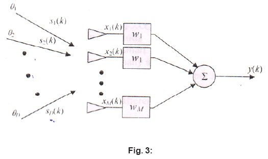 They are received by an array Of M elements with M potential weights Each received signal xM(k) includesadditive white Gaussian zero with mean noise. Time is represented by the kth time sample. Thus, the array output y can be given in the following form: