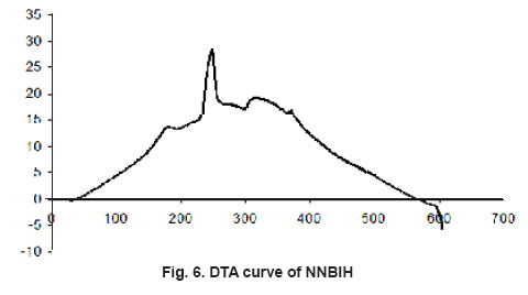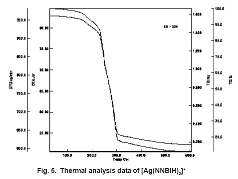 The thermal properties of these compounds were investigated by thermograms (TG, DTG and DTA). Fig. 5 shows TGA and DTA curves for[Ag(NNBIH)2]+. In the temperature range 40-165 °C, 3.6% weight losing was observed which was related to the loss ofmost parts of compound. In the temperature range from 165-230°C, 10.3% weight reduction was found, which was related to the loss of another part of compound. In the temperature range from 230-310°C, 74.4% weight reduction was found, which was related to the loss of another part of compound and the latest weight losing found in the 310-600°C temperature range in that 7.7% of the sample weight decreased that is related to lose of other part of the compound. Fig. 6 curves of differential thermal analysis (DTA) shows. In this method, phase changes or chemical reaction scan be tailored to the study of heat absorbed or released. This method for assessing changes in solids at high temperatures is suitable. Since the normal to the sample is heated, Endo thermic and exothermic processes occur during the heating of the sample. Exothermic processes are observed when by secondary reactions redecoration take place. NNBIH in the DTA curve Endothermic and exothermic process is observed. The endothermic process occurs at 180, 250 and 315C°. Heating processes are related to the formation of new bonds namely after passing through the broken bond sand endothermic process, due to redecoration and new bonds formed, heat is released in the environment. (The bond is associated with energy release). (Fig. 5, 6).