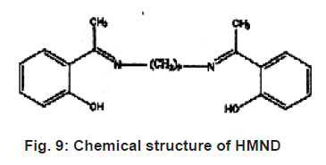 Anal:%69. Calcd of C25H34N2O2; C; 76.16, H; 8.62, N; 3.55; found: C; 80.21, H. 9.30, N; 4.98. Mp83-85 °C, ¹HNMR (DMSO): 6.9-8 (CH phenol), 1.7 (CH3), 3.7(N-CH2), 2.5 (CH2),10.9 (OH), FT-IR (KBr, cm-1): 1307s (νC-N), 1612 s (νC=N), 2921 br(νOH), UV-vis(DMSO): λmax 260nm(ε15000), 313nm(ε7000). HMND is soluble in acetonitrile, DMF, DMSO, dichloro methane and chloroform and insoluble in acetone,water, methanol, ethanol, diethyl ether and hexane.