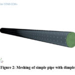 The computational domain was created for the simple pipe and for the pipe with dimple. The dimensions of the pipes were freeze according to the piping standards such as diameter of the pipe was 25.4 mm and length as 1000mm. Approximately the 14 dimples were arranged at the equidistant from each other on the outer periphery of the pipe for the 800mm length . First 200mm length kept without dimple in order to assure the formation of fully developed flow in the pipe. The type of the mesh created for the both the pipe were structured mesh by using Star CCM+ software. For good accuracy and conformity a mesh independence test was carried on the both the pipes. For simple pipe mesh count was 2.5 million, 2.8 million and 3.1 million and 2.8 million found to be with best agreement. For dimple pipe the mesh count was 3.2 million, 3.5 million and 3.8 million and 3.5 million found to be be with agreement for mesh independence test. Figure 1 shows the mesh of simple pipe and figure 2 shows the mesh of pipe with external dimple. Table 1 shows the geometry and mesh specifications.