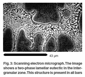 In the cross section of the bars, optical microscopy allowed to observe that bars are conformed by zones with different structure. For the bars cast at high speed, three zones were seen: i) a central zone with an average diameter of 24.8 mm (that it represents 68% of the traverse section); ii) a tin circular ring with a average width of 1.1 mm; iii) an exterior circular ring of a average width of 1.5 mm. The central zone is constituted by equi-axed dendrites of 7.5 μm of average width with an average length of 30 μm (Fig1). This central zone is the last one that solidifies, then, a vigorous convection should cause the breaking of the dendrites and their orientation loss .12 The intermediate ring has a columnar structure radially oriented, which indicates that the heat flow was normal to the wall of the mould. The exterior ring is the first solid formed , equi-axed grains with sizes in between 11 to 75 μm conforms this layer. For the bars cast at low speed, only two zones were seen:i) a central zone with an average diameter of 25.4 mm (that it represents 72.8 % of the traverse section); ii) an exterior circular ring of an average width of 2.3 mm. In this second group of bars, the grain shape in the bar core is made of dendrites in rosette shape (Figure 2) with a rosette diameter of 165 μm and, in the exterior ring, there is an irregular mix of dendrites, pieces of dendrite and equi-axed grains, these last ones with sizes between 15 to 45 μm. Lastly, in the inter-granular zone of the mentioned structures, a two-phase lamellar eutectic was observed (Figure 3). Finally, with the aid of scanning electron microscope, it was found that the dendrites are in fact eutectoid cells (Figure 4) .13 In addition, in detail, the lamellar spacing inside the eutectoid cells is finer than the one observed in the inter-granular zone.