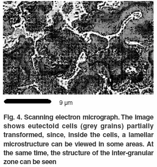 At interior of grains and dendrites a lamellar microstructure conformed by the α’s and η’s phases was observed (eutectoid cells). In the inter-dendritic zone, a two-phase lamellar eutectic was viewed. The lamellas of eutectoid cells are finer than the lamellas of the inter-dendritic eutectic.