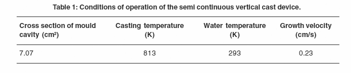 Circular bars of Zn-22Al-2Cu (wt. %) alloy 30 mm in diameter with a length of 1.5 m were prepared by using the semi-continuous vertical casting process.4 An aluminium mould cooled with circulating water having a cylindrical cavity was used. The melt was poured into the cavity and the solidifying material was mechanically extracted by the inferior part of this cavity. A second cooling stage was needed directly on the leaving rod by using water dew. Table 1 shows the optimal values, experimentally determined, of the cast parameters.