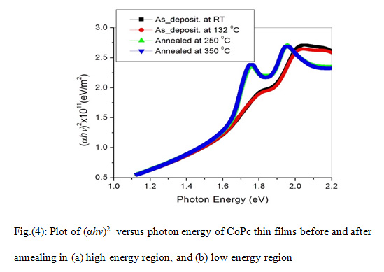 The optical absorption coefficient (α) of CoPc thin films as a function of incident wavelength over the range 400-800 nm were represented in Fig. 3 . Whereas, CoPc thin films present relatively high optical absorption coefficient at wavelength range about (2.3- 2.7) x 105cm-1. This result is in a good agreement with several published results [23,27]. Besides, both the deposited film and the one prepared under the substrate temperature (132 0C) show no effect of the substrate temperature on the absorption coefficient values. This is a good confirmation that the spectra of these two samples are characteristic for the same α- CoPc phase. Moreover, the Q-band existed for the same wavelength range, is consisting of two distinct peaks. While the lower wavelength peak at 613 nm is related to Qy band as a result of a1u(π)→eg*) transition, the higher wavelength at 687 nm has been attributed either to the Qx as a result of exitonic transition  or to the vibrational interval [28-31]. Furthermore, as in Fig.(3), not only the shape of Q-band in the absorption coefficient spectra provides good evidence for molecular ordering but also the post growing annealing had a significant effect on the variation in the orientation and/or molecules packing within CoPc thin films as a result of phase transition from α to β. Besides, the Davydov’s splitting of the Q-band was observed to decrease from 74 into 70 nm, in which the splitting is proportional to the inverse cube of the molecular separation [16]. This splitting is a good indication for that a slight increase in the molecular separation occurred for the samples submitted to post growing annealing at 250 and 3500C for 3h. Additionally, one can clearly see a slight increase in the relative intensity for higher wavelength peaks of Q-band. This finding is consistent with previously several reported results [14, 32].