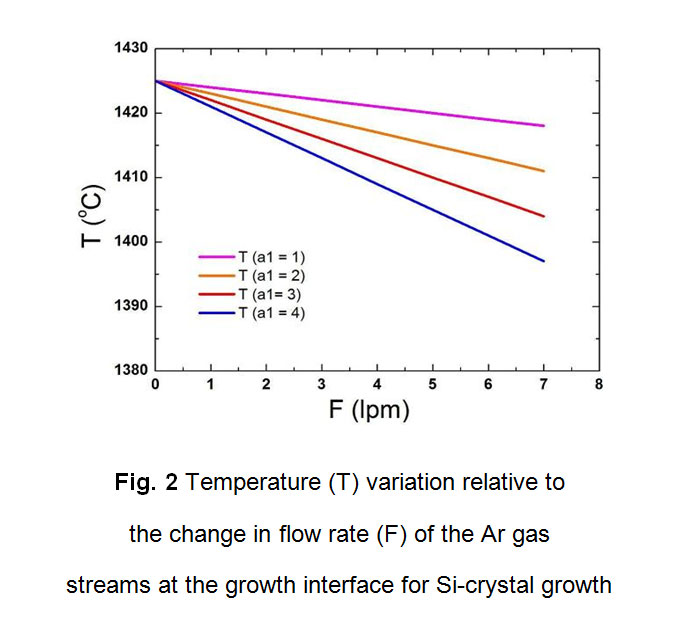 Fig. 2 Temperature (T) variation relative to  the change in flow rate (F) of the Ar gas  streams at the growth interface for Si-crystal growth