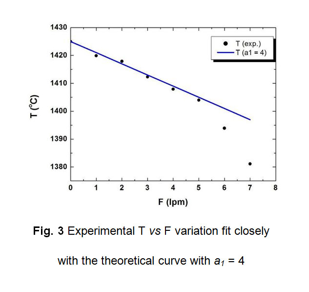 For generating the equations by curve fitting, an estimated data is used based upon the initial working of the equipment; such as the gas flow rate used ranges 0-7 lpm. A maximum value used for the heater temperature is 1425 oC, almost 15 oC above the MP (melting point) of silicon. Using this, the temperature variation, T above the die top edges is estimated as the Ar gas flow rate, F is increased. Solutions with both linear and 2nd order equations have been developed numerically, but only the linear ones are presented here, as indicated by equation (1):
