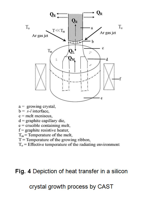Consider Fig. 4, describing different heat transfers occurring in the high temperature CAST system for the silicon crystal growth process. The heat balance at the growth interface can be given by [1-3]: