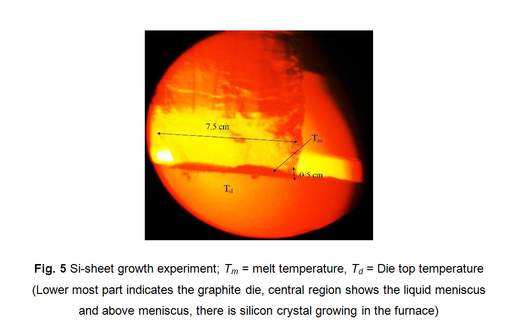 where T=Die top temperature,Tm = Melting point temperature,s = Meniscus height, td = Die top thickness, t = crystal thickness. For a series of experiments performed with same thickness of die top (td), other physical quantities like die top temperature (Td), meniscus height (s) and crystal thickness (t) may vary depending upon the different growth conditions during experimentation while Tm for silicon material remains constant. The values of different variables which are required to be substituted in equation (7) are obtained from the calibration of the values such as crystal width, crystal thickness, meniscus height etc. at some specific positions of the grown crystal during and after the experiment. The calibrated values used for obtaining the temperature gradient for one such calculation is illustrated here. Consider Fig. 5 clicked at any instant during Si-sheet crystal growth, a print of this picture is taken and different dimensions are measured. These dimensions are then compared with the actual values of the crystal width and die top width for the specific experiment and the values obtained thereby are used for the calculation of G from equation (7). The values used are: Td = 1452.5 oC, s = 0.087 cm and t = 0.156 cm and G is obtained as 315.7 oC/cm. The G values for different growth conditions are summed up and presented in Table 2.