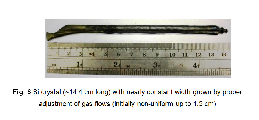 Figure6: Si crystal (~14.4 cm long) with nearly constant width grown by proper adjustment of gas flows (initially non-uniform up to 1.5 cm)
