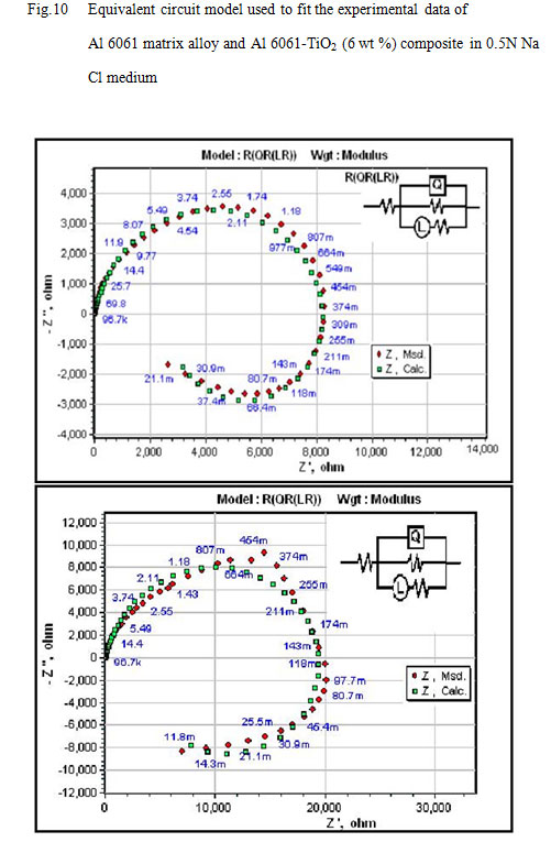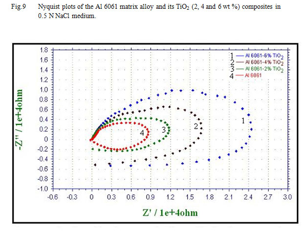 8. The Nyquist plots of the matrix alloy and the composites in NaCl medium show semicircles indicating that the corrosion process is mainly charge transfer controlled. The measured value of polarization resistance Rp increases while the CPE value decreases with increase in content of the reinforcement in all the cases.