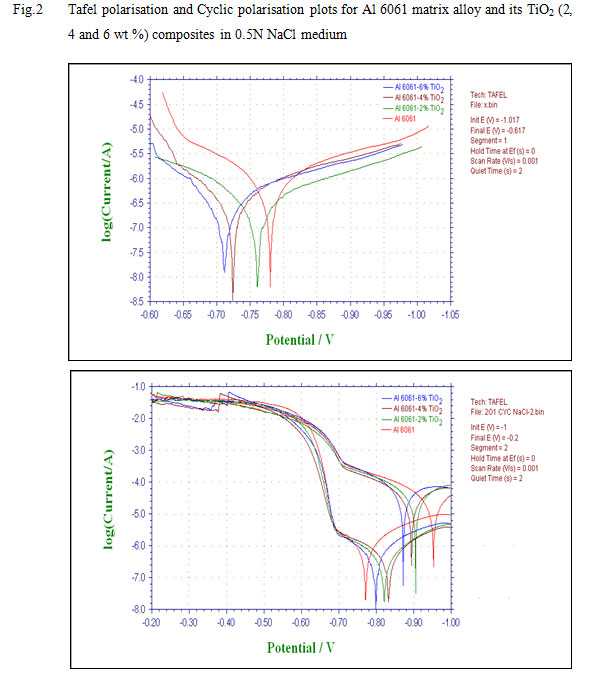 Typical polarisation curves for Al 6061 matrix alloy and the composites containing 2, 4 and 6 weight % of TiO2 particulates in 0.5N NaCl medium is shown in Fig.2. It is observed from the Tafel plots and Table 2 that both the corrosion current (ICORR) values and the corrosion rates decrease with increase in TiO2 content in the composites. This observation is similar to the findings in SiC reinforced Al composites [4] by Bhat et al.that the composites exhibit reduced corrosion rate compared to the matrix alloy. The decrease in corrosion current with increase in TiO2 content in the Al 6061-composites can be attributed to the reduced anodic areas for dissolution with increasing TiO2 areas. The increased corrosion resistance in composites is believed to be due to the action of TiO2 as physical barrier to the initiation and development of pitting corrosion, thereby modifying the microstructure of matrix.