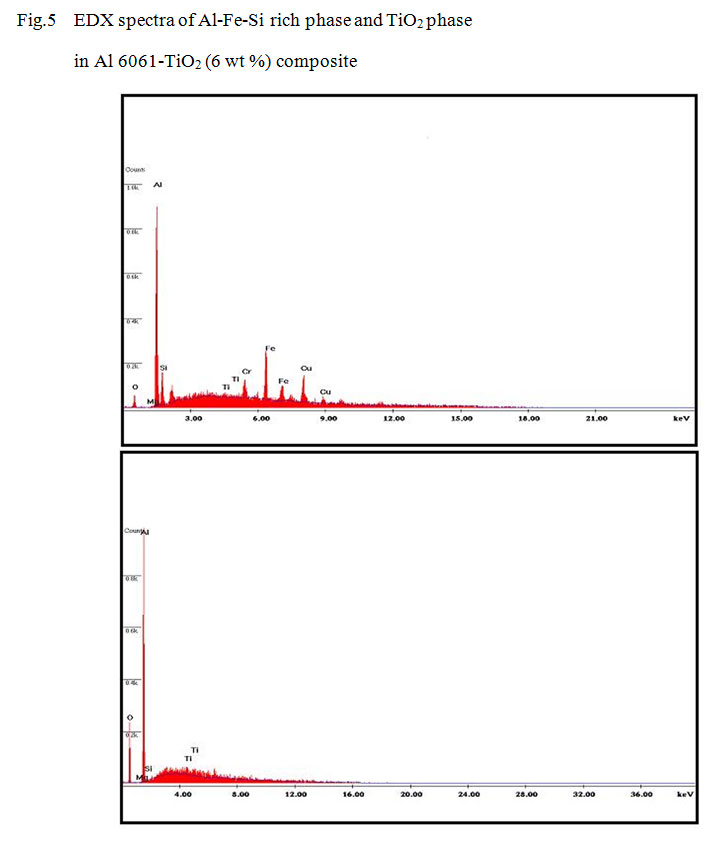 Figure 5: EDX spectra of Al-Fe-Si rich phase and TiO2 phase in Al 6061-TiO2 (6 wt %) composite