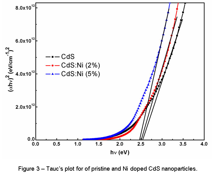 The size of the nanoparticles has been estimated using Brus’s empirical formula9 and found to be 6 nm for pristine CdS, 7 nm for CdS:Ni (2%) and 14 nm for CdS:Ni (4%) which is comparable  to Bohr radius (10.4 nm) of CdS.12 Hence, pristine CdS and Ni-doped CdS as synthesized nanoparticles both are observed to fall within the quantum confinement regime.