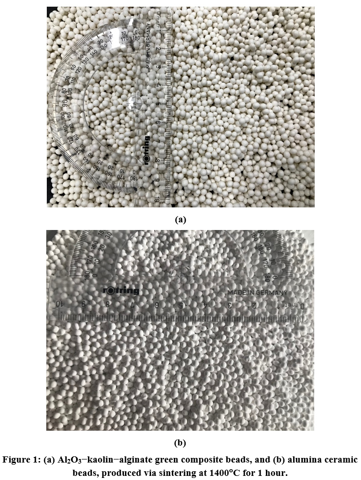 Figure 1: (a) Al2O3−kaolin−alginate green composite beads, and (b) alumina ceramic beads, produced via sintering at 1400°C for 1 hour.