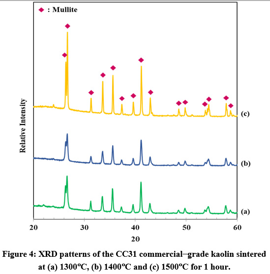 Phase analysis of the monolithic CC31 commercial-grade kaolin sintered at 1300°, 1400° and 1500°C depicted that kaolin to mullite reaction series were completed in all these temperatures. Mullite phase was detected in all samples (Fig. 4).