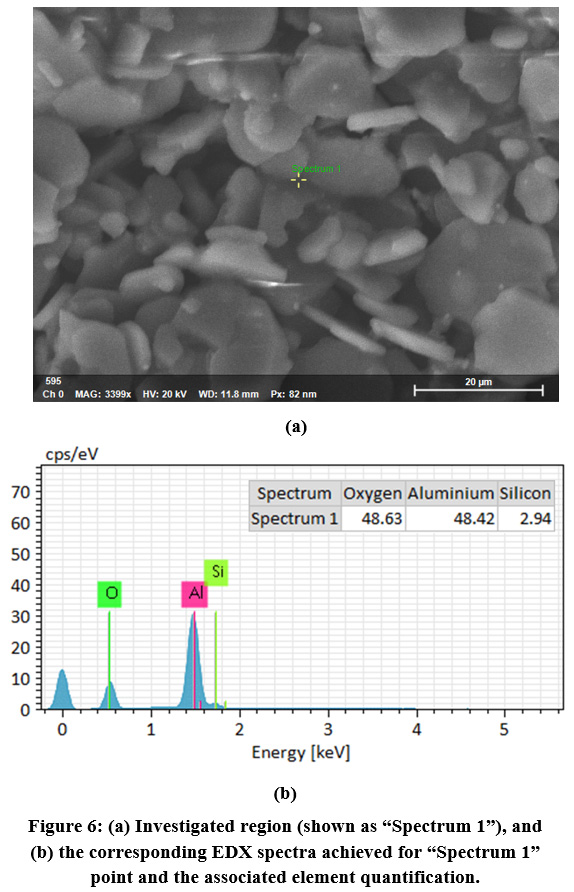 EDX analysis of the sample sintered at 1400°C for one hour is given in Fig. 6.  The chemical analysis of the grain boundary phases revealed that there is some silicon and sodium at the grain boundary phases due to CC31 commercial-grade kaolin sintering aid.